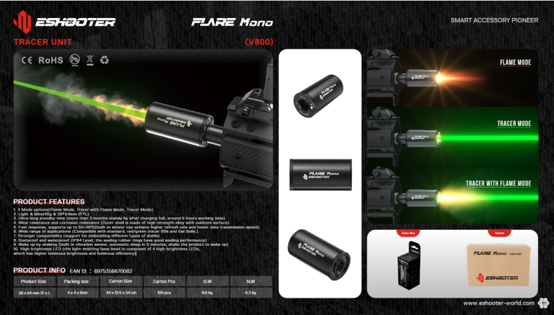8 modos disponibles (Destello de boca de fuego, Rastro con destello de boca, Rastro, Proporción de rastro, Destello de boca + humo, Rastro con destello de boca + humo, Rastro + humo, Proporción de rastro + humo)